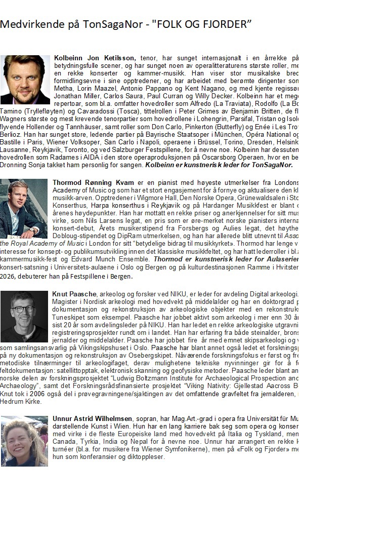 TonSagaNor inviterer til en konsertopplevelse der musikk og historie veves sammen til en kunstnerisk helhet. Publikum tas med på en reise gjennom Norges og Islands rike musikkarv, samtidig som de historiske linjene trekkes tilbake til jernalder og vikingtid.